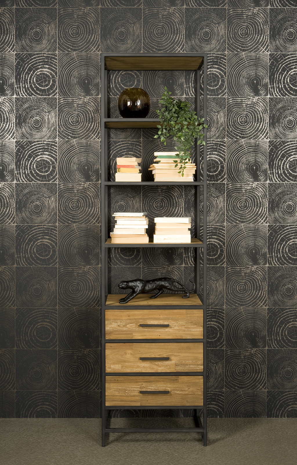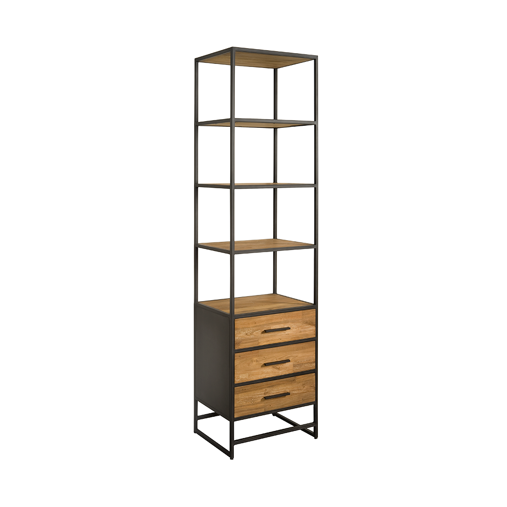 Bücherregal Fidenza stammt aus der schönen Fidenza-Serie von Weltdeko. Das Bücherregal im industriellen Look ist ein echter Hingucker. Das Bücherregal besteht aus recyceltem Teakholz und Metall. Das Bücherregal besteht aus einem Stahlrahmen mit Schubladen und Regalen. Der Stahlrahmen ist wie die rechteckigen Griffe, die an den Schubladen befestigt sind, mit einer schwarzen Pulverbeschichtung versehen. Dieses robuste Bücherregal ist 60 cm breit, 45 cm tief und 220 cm hoch. Das Bücherregal verdankt sein industrielles Erscheinungsbild der Kombination von Holz und Stahl. Teakholz ist bekannt für seine hervorragende Qualität.