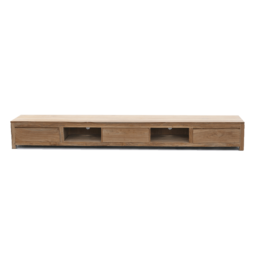 Fernsehschrank Civo ist ein wunderschöner Schrank aus massivem Teakholz mit einer schlanken Platte. Der Schrank kann in verschiedenen Einrichtungsstilen kombiniert werden. Fernsehschrank Civo verdankt sein zeitgemäßes Design seiner hellen Holzfarbe. Der Artikel hat dicke quadratische Beine. Diese groben Beine verleihen dem Schrank ein robustes Aussehen.