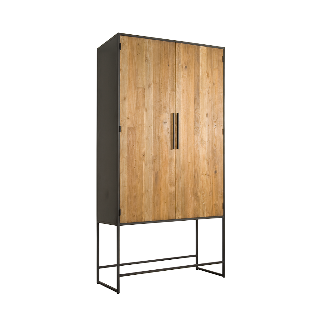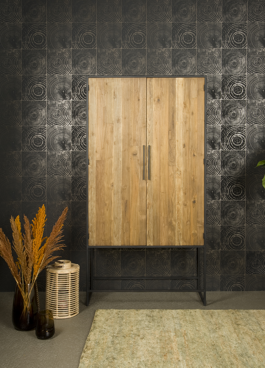 Der Kabinettschrank Felino ist ein wunderschöner Aufbewahrungsschrank aus der Fidenza-Serie. Der Schrank besteht aus recyceltem Teakholz und Metall. Der Schrank ist mit einem schwarzen Holzrahmen eingerahmt. Die Basis besteht aus Stahl und ist mit einer schwarzen Pulverbeschichtung versehen. Der Schrank verdankt sein industrielles Erscheinungsbild der Kombination von Holz und Stahl. Teakholz ist eine der qualitativ hochwertigsten Holzarten. Der Kabinettschrank Fidenza ist 116 cm breit, 45 cm tief und 220 cm hoch. Er ist ein echter Hingucker in Ihrem Interieur. Der Schrank hat zwei Türen mit jeweils einem Metallgriff, der wie der Rahmen mit einer schwarzen Pulverbeschichtung versehen ist.